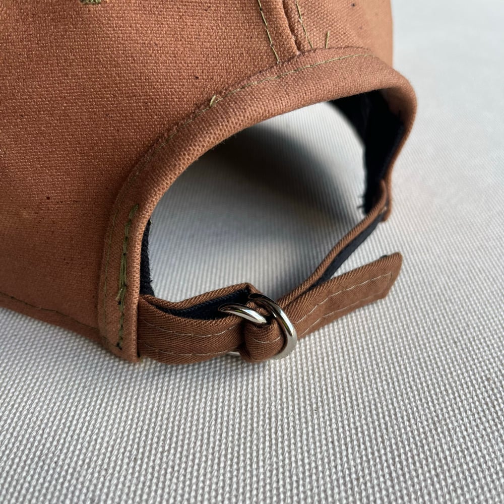 This fabric is heavyweight and stiff at 15oz (feels even heavier) and will take some time to break in. It has been hand dyed using natural Kakishibu tannin by Mami from @ptworksdesign in Toyama, Japan. The stencils (only on the underside of visor) were created using a dye resistant glue during the dyeing process. Each cap is different and is a one-off.