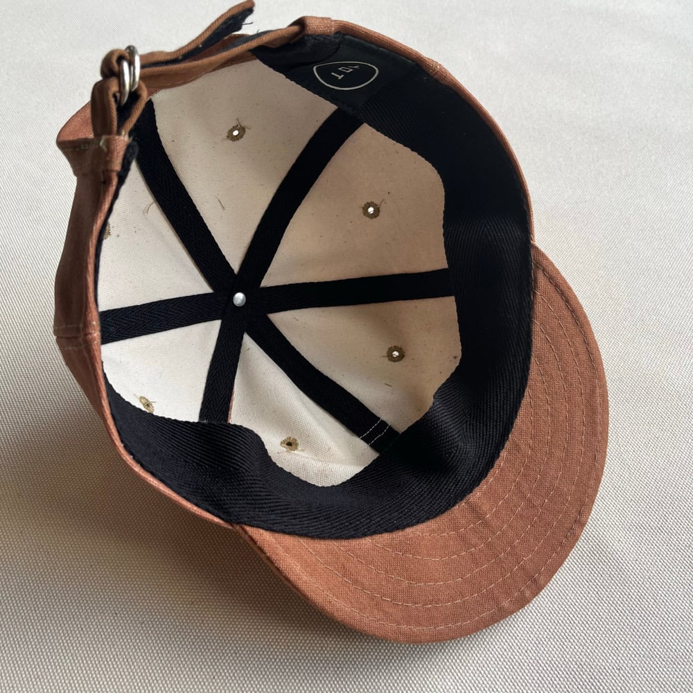 This fabric is heavyweight and stiff at 15oz (feels even heavier) and will take some time to break in. It has been hand dyed using natural Kakishibu tannin by Mami from @ptworksdesign in Toyama, Japan. The stencils (only on the underside of visor) were created using a dye resistant glue during the dyeing process. Each cap is different and is a one-off.